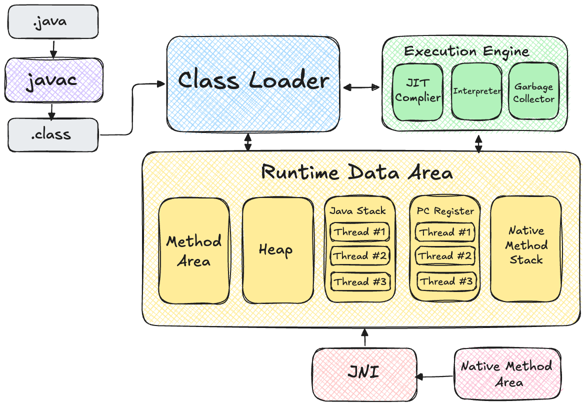 JVM은 크게 런타임 데이터 영역 (Runtime Data Area), 실행 엔진 (Execution Engine), JNI (Native Method Interface), Native Method Library로 이루어져 있습니다.