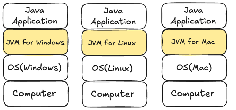 물론, 기존에 애플리케이션이 OS에 종속적이었듯, JVM도 역시 OS에 종속적이기 때문에 각 OS에 맞는 JVM을 설치해야 합니다.