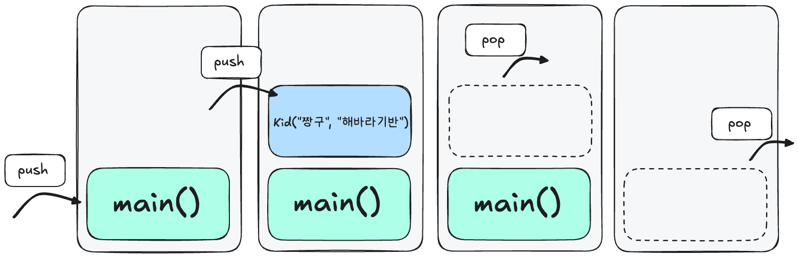 예시 코드에서는 kid 객체와 kid가 참조하는 String 리터럴 "짱구" 그리고 "해바라기반" 객체도 모두 힙 영역에 만들어진다고 이해할 수 있습니다.