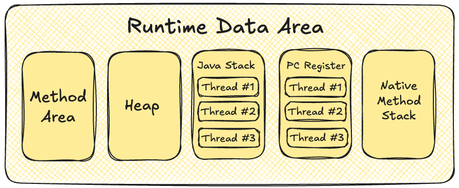 Runtime Data Area는 Method Area, Heap, Java Stack, PC Register, Native Method Stack으로 이루어져 있습니다.
