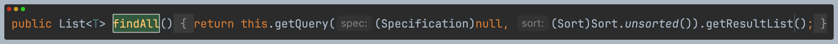 `findAll()`은 내부에서 `getQuery(...)`를 호출해서 쿼리를 실행하고