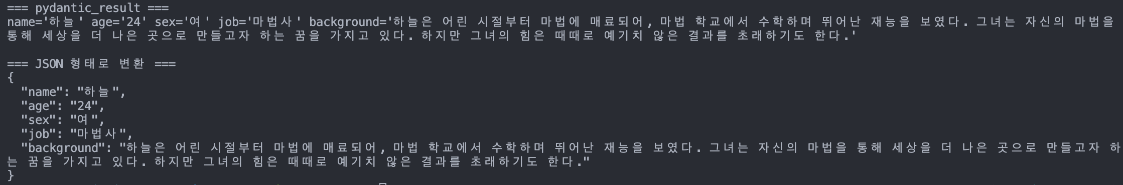 Pydantic을 이용해 구조화된 답변을 생성하는 과정을 가장 간소화한 예시코드를 작성해 보았습니다.