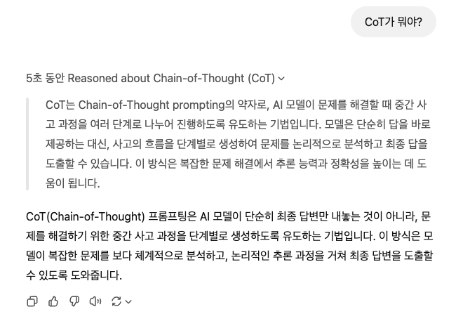 또한 GPT의 경우 o1모델부터 내재된 CoT 능력이 크게 향상되어 명시적으로 지시하지 않아도 어느 정도 자연스럽게 중간 추론 과정을 거쳐 답변을 생성하는 경향이 있습니다.