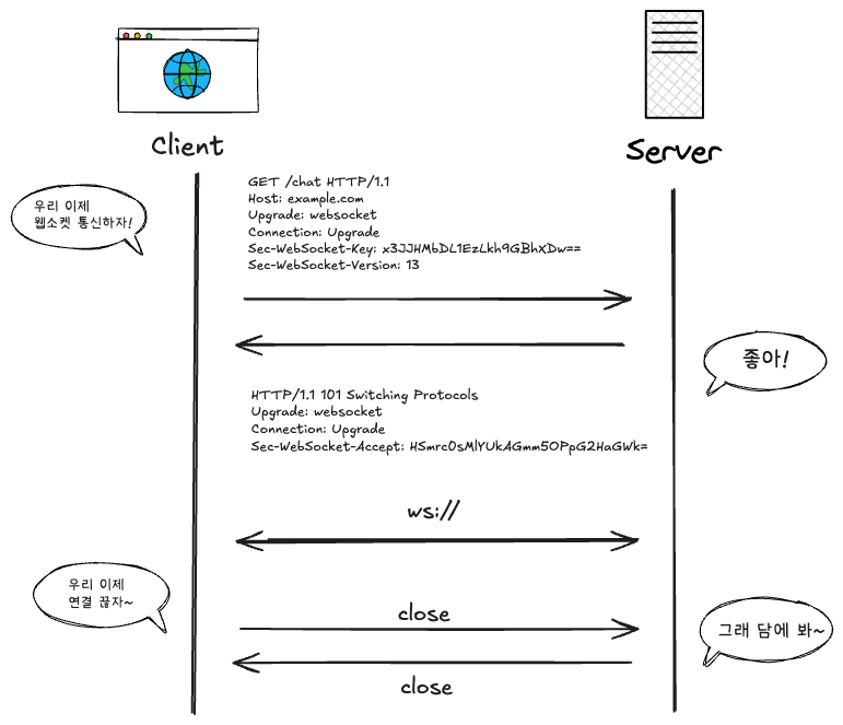올해 초 종합 운세 웹 서비스 프로젝트를 진행했습니다.저희 사이트에는 사용자의 사주 정보를 기반으로 대화 상대를 추천해 주고 채팅으로 연결해 주는 기능을 제공하고 있는데, 저를 포함한 두 명이 이 기능을 담당했었습니다.채팅 기능을 구현하기 위해 웹소켓 프로토콜 통신을 이용했고, 그때의 경험과 기억을 살려 정리해두면 좋겠다 싶어서 글을 작성하게 되었습니다. 사실 자잘한 버그들이 조금 있기도 하고, 추가해야 할 기능들이 있어서 아직 홍보는 따로 안하고 있지만, 기능이 궁금하신 분들은 https://www.unsemawang.com 접속하셔서 이용해보실 수 있습니다. 🔍 목차# 00. 기존 실시간 양방향 통신 방법# 01. WebSocket WebSocket? WebSocket 핸드셰이크# 02. STOM..